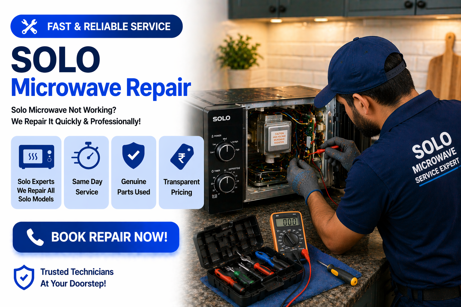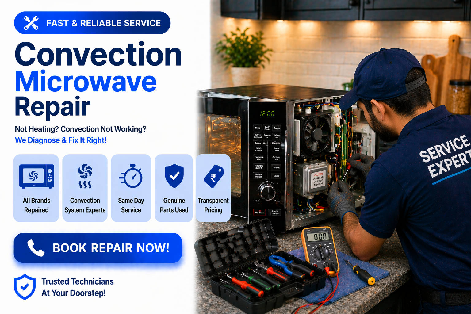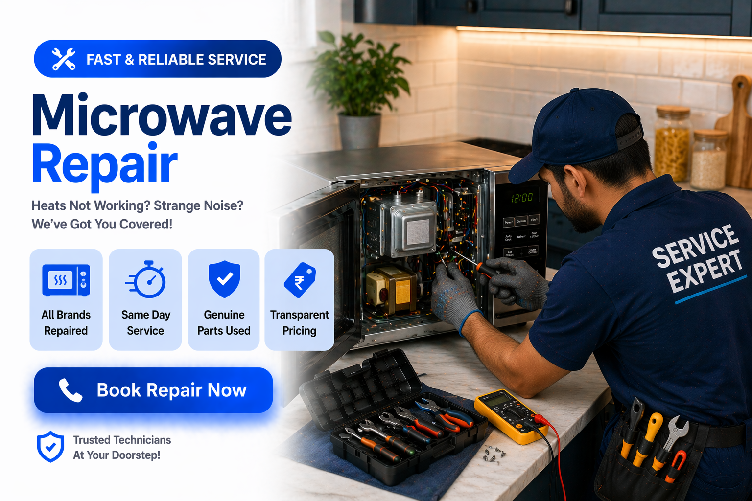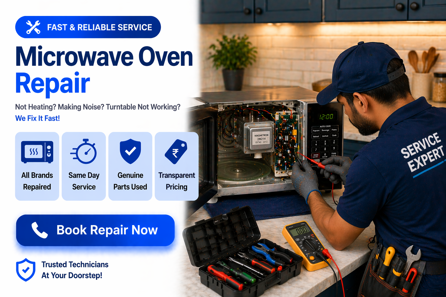We provide fast and reliable microwave repair services near you with certified technicians. Get same-day doorstep service for all brands and models. Facing issues like not heating, sparking, power problems, or button faults? Our experts quickly diagnose and fix all problems using genuine parts.